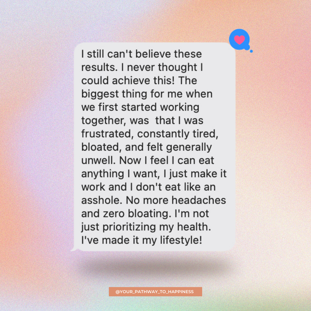 I take all your medical conditions into account when designing your nutrition program. With weekly check-ins and 1:1 coaching via text, I support you through the ebbs and flows of your journey.
